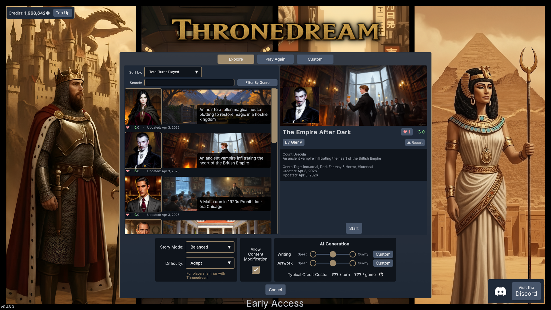 How it works: Thronedream uses real-time AI generation, which has real costs. Creating an account gives you an initial batch of free credits, and you get more free credits when you login every day. You can purchase additional credit packs to play as much as you want and unlock additional game modes.